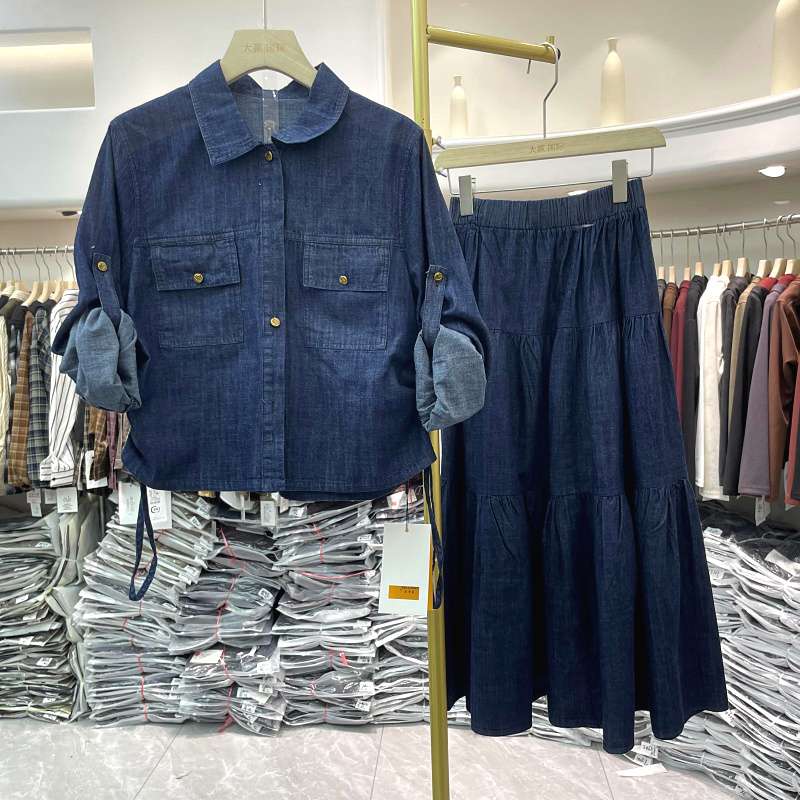 カジュアルながら女性らしさを演出するデニムセットアップ。上着は襟付きで胸ポケットがアクセント。スカートはティアードデザインで動きやすく、ウエストゴムで着心地も快適。オフィスカジュアルや休日のお出かけにぴったりの一着。